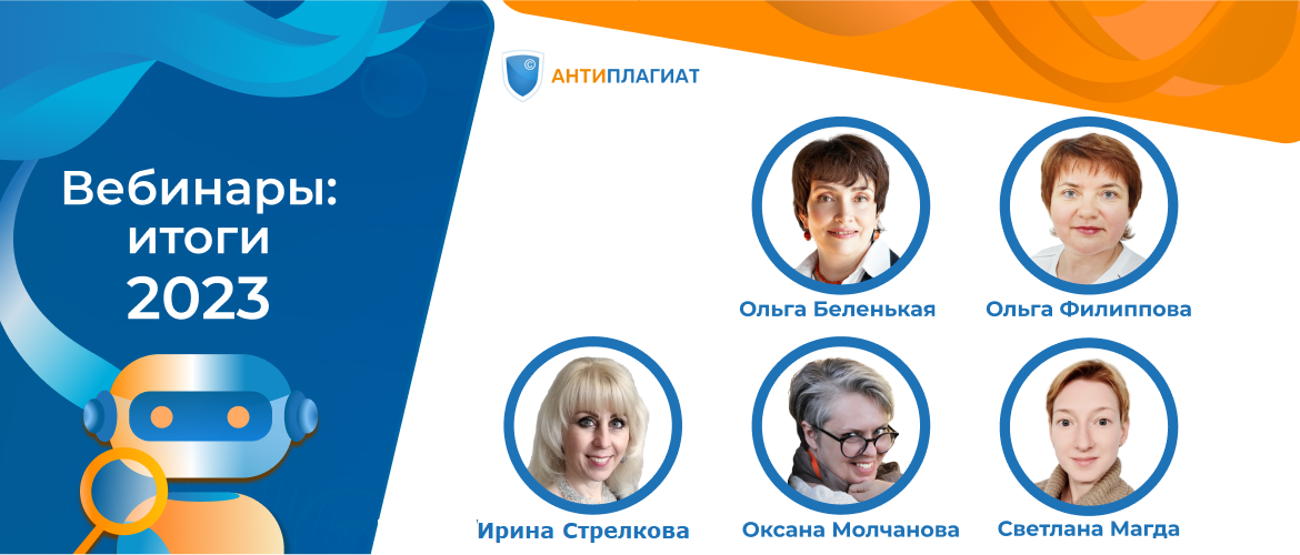 Базовые вебинары Знакомство с системой «Антиплагиат». Часть 1. Начала и Знакомство с системой «Антиплагиат». Часть 2. Основы работы с отчетом с ноября 2023 года проводит новый специалист учебно-методического центра Светлана Магда. Новый формат «беседа двух спикеров в эфире» попробовали Ольга Беленькая и Ольга Филиппова на декабрьском вебинаре Новый полный отчет в Антиплагиате: удобство и экспертиза. Вместе со слушателями ведущие разобрались во всех тонкостях работы с новым видом полного отчета.